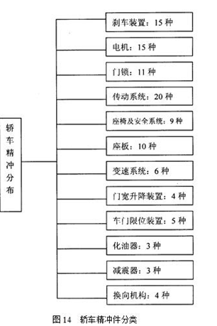 精沖工藝技術的發展,使其進入了各個工業領域,得到廣泛的應用。對于要求最小尺寸公差、具有最小粗糙度的功能零件,可以廣泛使用精沖零件。而對于有視覺要求的、很精細的表面零件,也可使用精沖零件。現今,精沖件的生產品種、尺寸形狀、材料厚度和力學性能都有很大的提高。而且為了適應市場需求,生產的均衡性、質量可靠性和加工經濟性更加突出。汽車工業是精沖技術推廣應用的重中之重,一輛轎車精沖零件擁有量為40~200件,它占轎車沖壓件的60~70%,如下圖所示:
